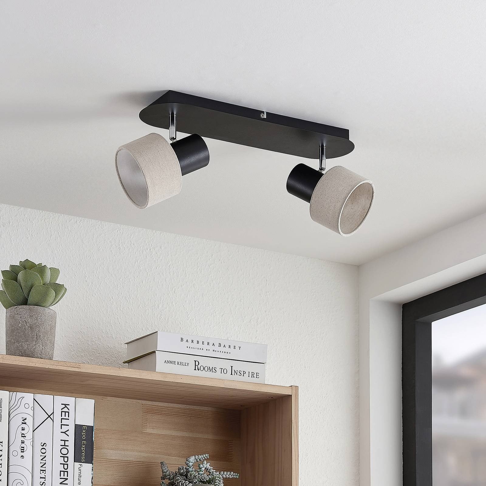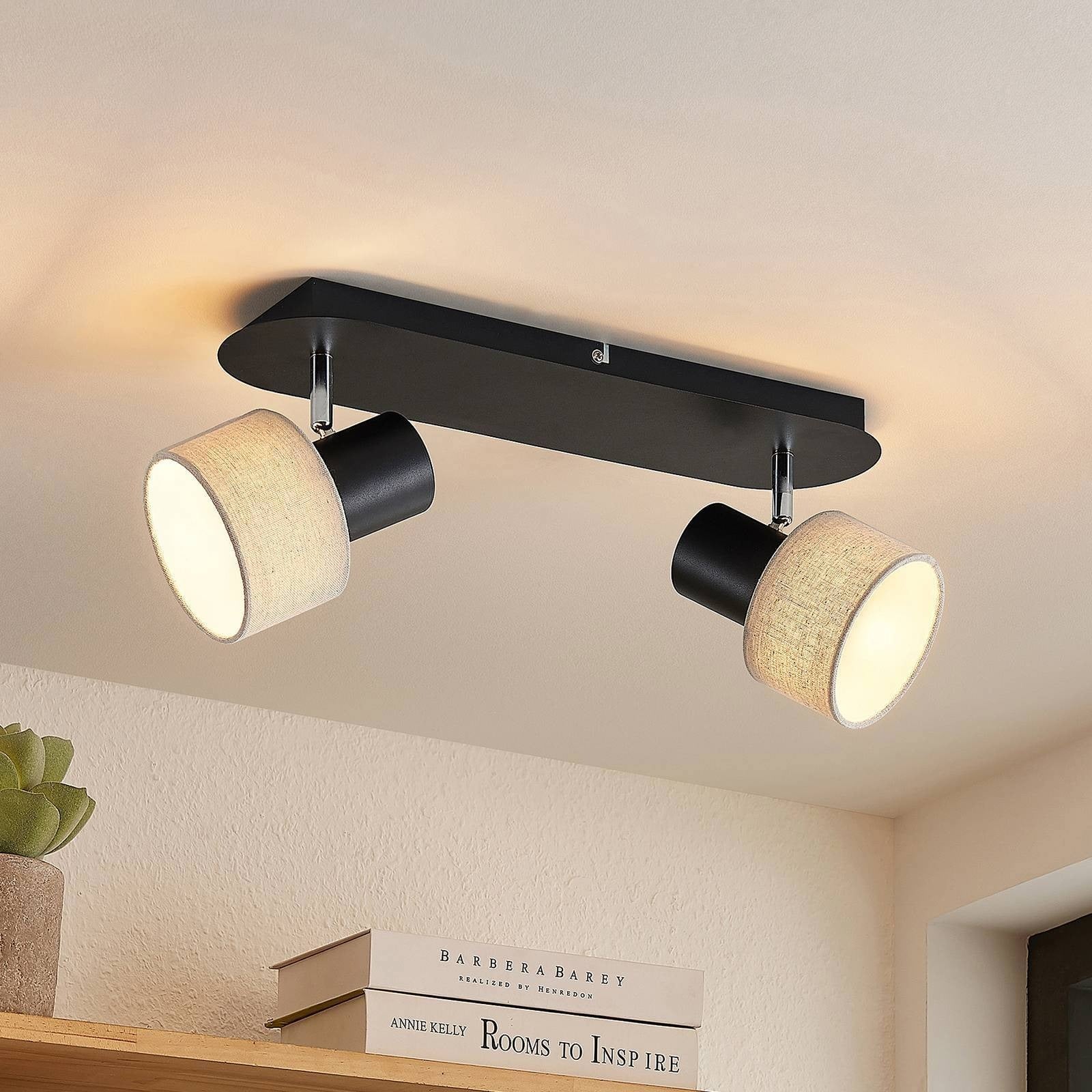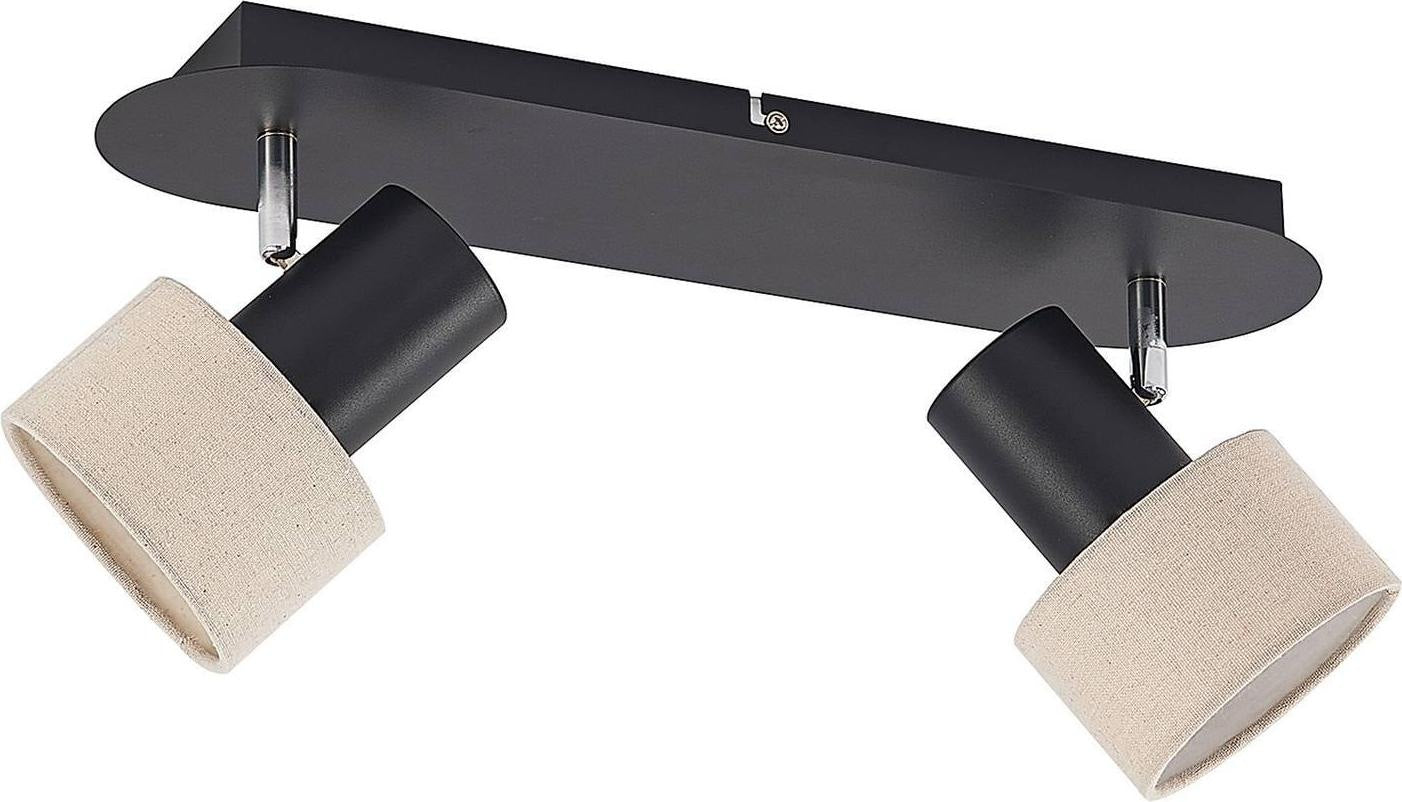 Deckenlampe Heribert in schwarz mit beige besticht durch harmonisches Aussehen und eine gemütliche Farbkombination. Es besteht aus schwarzem Eisen und hat zwei beige Lampenschirme, die mit GU10-Lampen ausgestattet werden können. Regenschirme beeindrucken mit ihrem zylindrischen Aussehen und ihre Stoffwände dämpfen angenehm das erzeugte Licht. Die Heribert Deckenlampe ist ins Wohnzimmer, aber auch in anderen Räumen findet sie ihren idealen Platz. Es integriert sich gut in moderne Gerätestile und schafft eine gemütliche Atmosphäre.