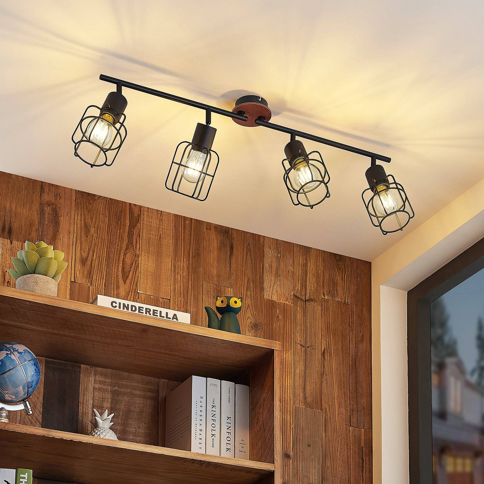 Lange Telmos Deckenstrahler für leuchtende Wohnzimmer oder Flure. Der Deckenstrahler Telmos hat einen runden Deckenhalter mit zwei langen Zahnspangen. An jedem Halter sind zwei Lampenschirme angebracht. Ihr käfigartiges Aussehen bietet einen freien Blick auf die zu verwendenden Lichtquellen, so dass sie dekorativ ausgewählt werden sollten. Da sich Licht ohne Hindernisse entfalten kann, ist eine gute Raumbeleuchtung garantiert. So bietet Telmos nicht nur im Wohnzimmer, sondern auch in einem langen Flur im Dunkeln genug Licht.