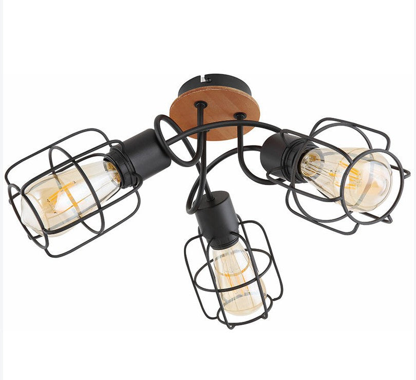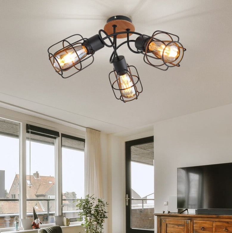 Diese Deckenlampe überzeugt durch ihr simples Design aus schwarzem Metall. Sie besteht aus einer runden Holzplatte, an die drei formschön ineinander geschwungene Metallstäbe fixiert sind. Diese sind mit drei schwenkbaren, von schwarzem Metall umrahmte E27-Fassungen mit Metallgitterschirm versehen, welche mit passenden Leuchtmitteln Ihrer Wahl bestückt werden können. Dadurch sind Sie in der Lage, Lichtfarbe und Helligkeit individuell zu bestimmen. Die Leuchtmittel sind nicht im Lieferumfang enthalten.