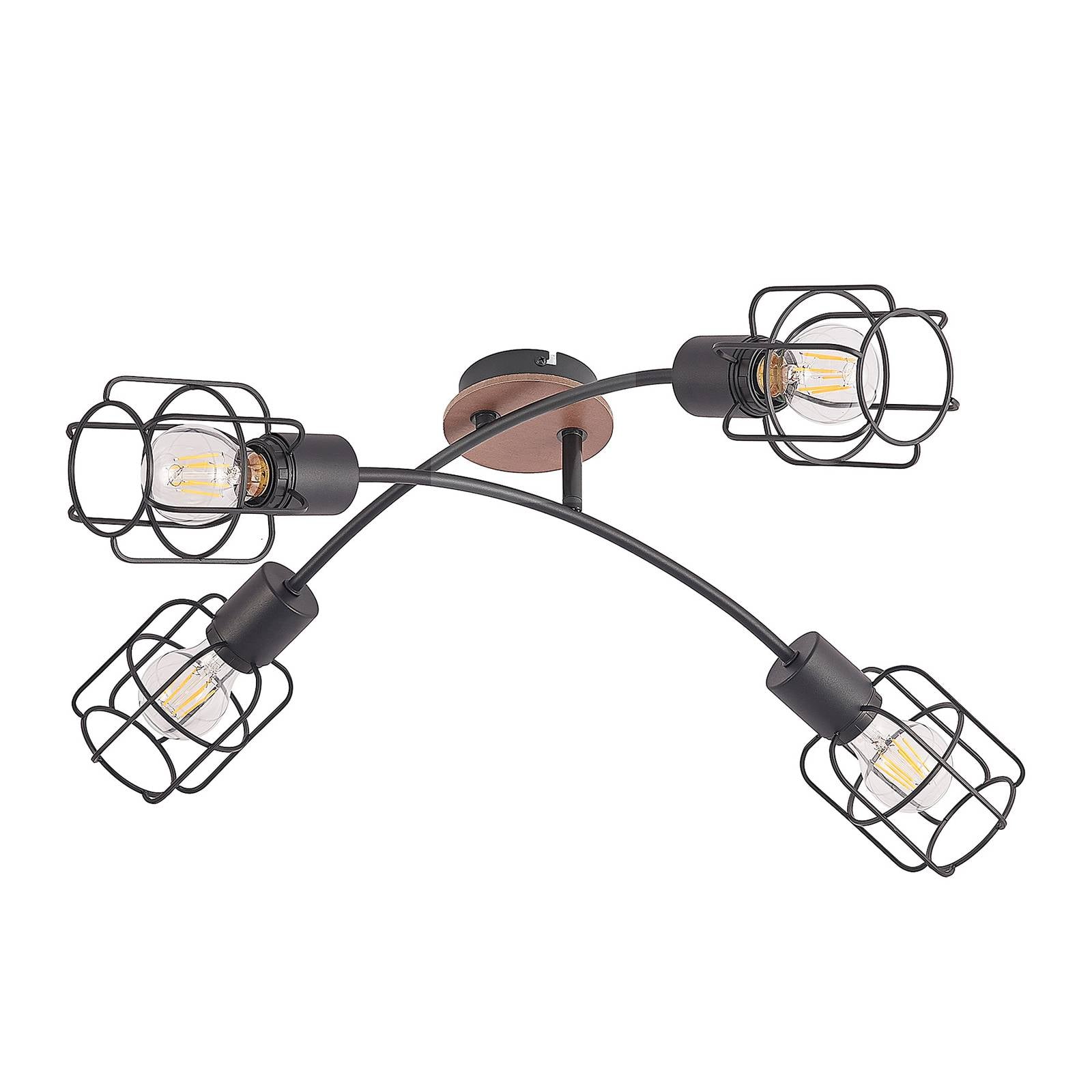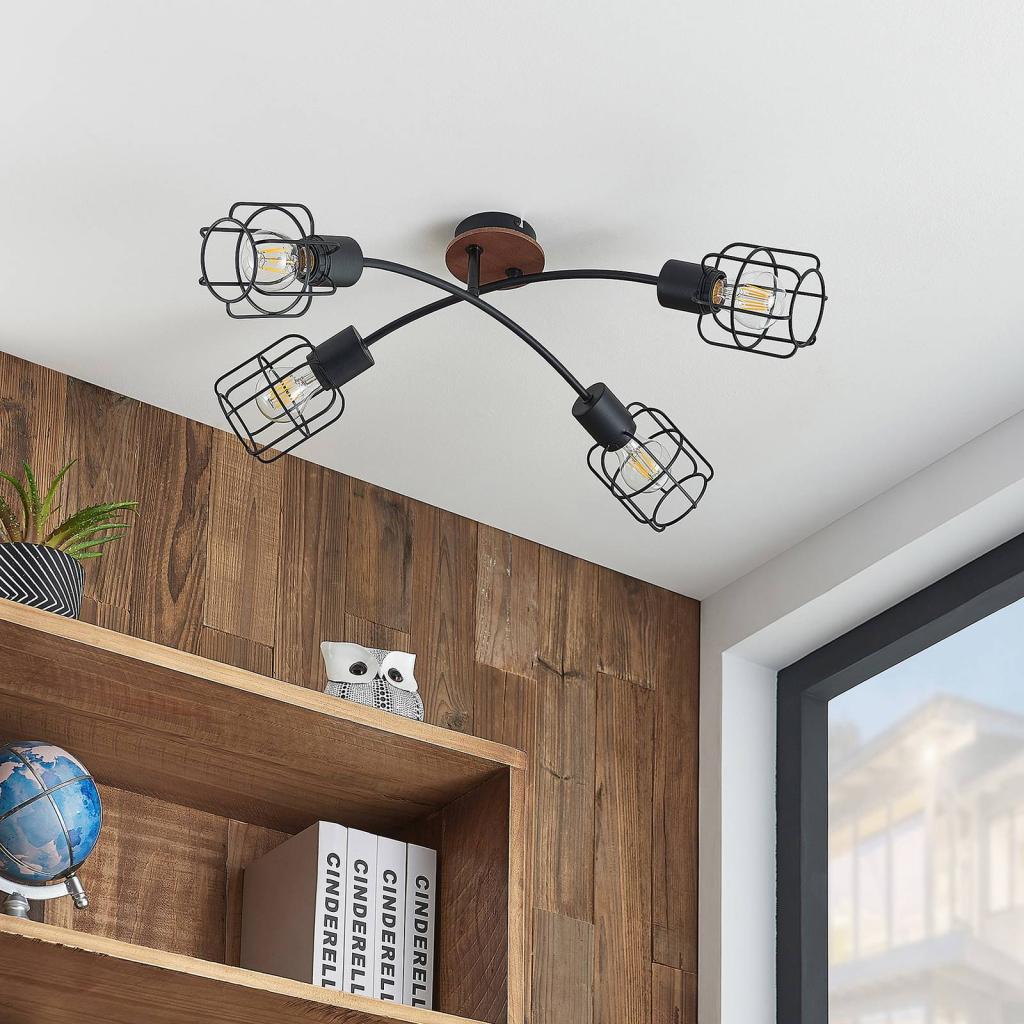 Die Deckenlampe Telmos wird in einer Version mit vier Flammen präsentiert, die im Wohnzimmer oder Flur perfekt genutzt werden kann. Zwei Metallstreben sind an der runden Deckenhalterung befestigt. Am Ende jeder der Streben sind die Lampenanteile in Form eines Käfigs, die sofort Aufmerksamkeit erregen. Diese dunkle Lampe hat einen individuellen Look und kann mit verschiedenen Gerätestilen kombiniert werden.