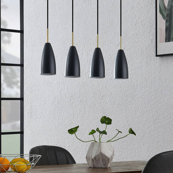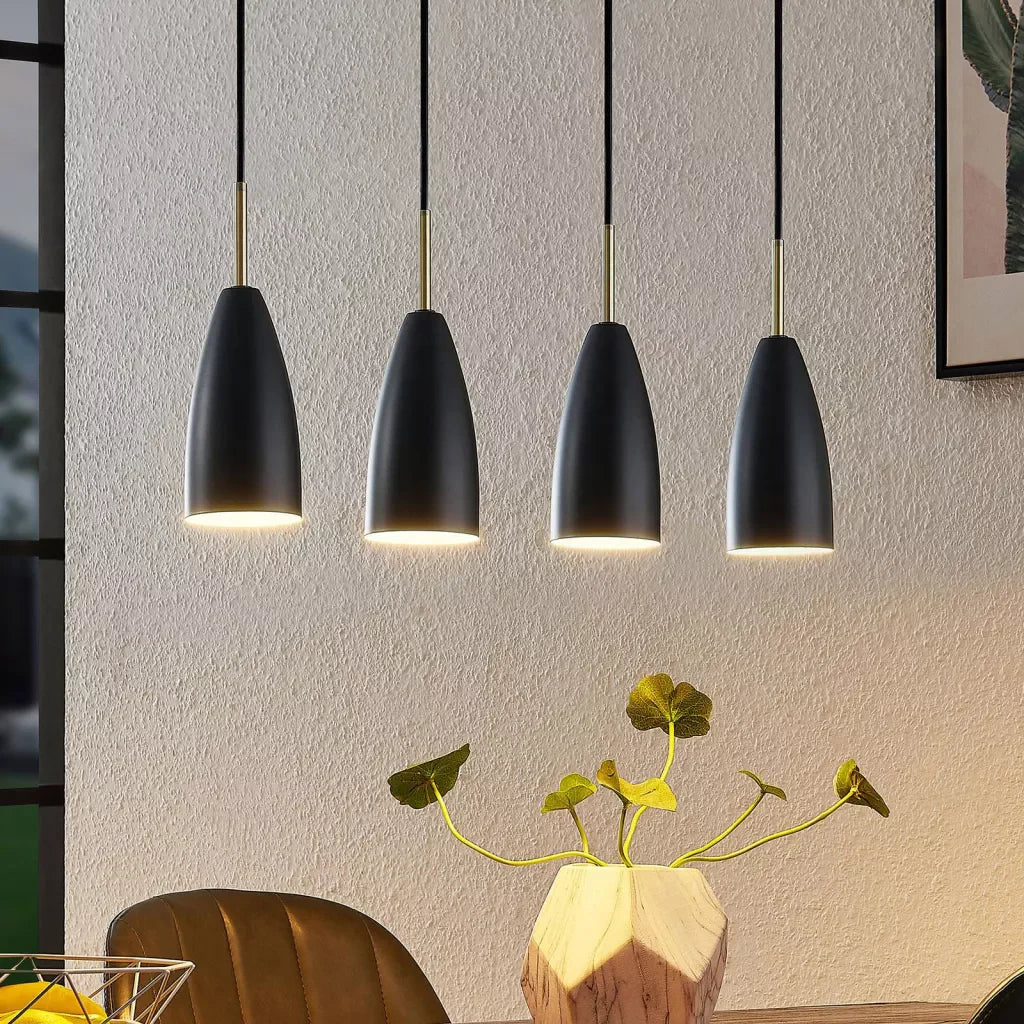 Die Lindby Caylee Pendelleuchte überzeugt mit modernem Design in Schwarz und eleganten Goldakzenten. Vier schlanke Metallschirme sorgen für eine gleichmäßige, angenehme Ausleuchtung und setzen stilvolle Highlights über Esstisch oder Kücheninsel. Die Leuchte ist mit vier E14-Fassungen ausgestattet und ermöglicht eine flexible Wahl der Leuchtmittel. In Kombination mit dimmbaren Leuchtmitteln ist sie dimmbar und passt sich jeder Lichtstimmung an. Gefertigt aus robustem Eisen überzeugt sie durch Langlebigkeit und Qualität. Ideal für moderne, industrielle und anspruchsvolle Wohnkonzepte.