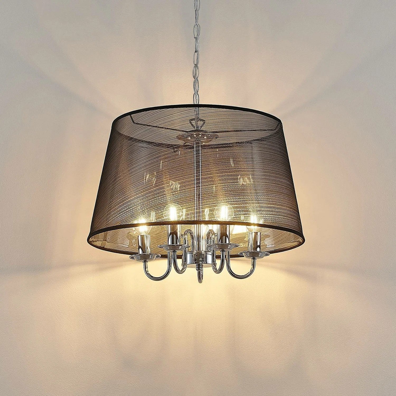 Die Pendelleuchte Talisha von Lindby besticht durch eine stilvolle Verbindung aus sanftem Stoff und kühlem Metall: Ein großzügiger Schirm aus schwarzem Organzastoff lässt das Licht dezent durchscheinen und verleiht dem Raum eine elegante, atmosphärische Stimmung. Gleichzeitig setzen feine Chrom-Details und eine schlichte Deckenhalterung glanzvolle Akzente, wodurch die Lampe sowohl modern als auch edel wirkt. Mit einem Durchmesser von ca. 50 cm und einer Höhe von etwa 34 cm bietet der Schirm ausreichend Fläche, um ein weiches, gleichmäßiges Licht zu erzeugen — ideal über Ess- oder Wohnzimmertischen.