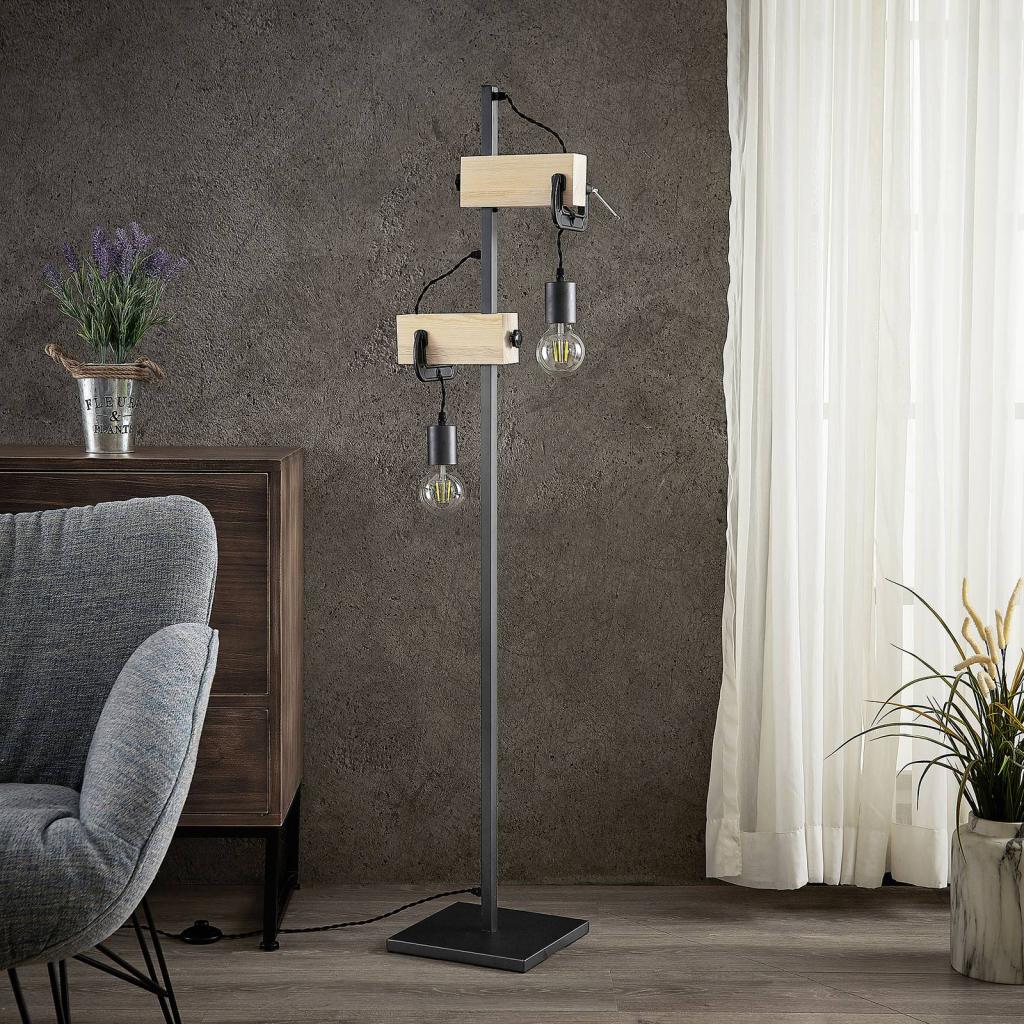 Rustikale Stehlampe Asya aus schwarzem Eisen und Eichenholz mit dem Geschmack eines Landhauses. Bodenlampe Asya besticht durch ein spannendes und solides Design. Aus dem quadratischen Sockel steigt eine schlanke Eisensäule auf, in der zwei Eichenbänke aus Holz montiert sind, die in eine Richtung gerichtet sind. Am Ende dieses Holzbalkens befindet sich ein Element in der siegreichen Optik, die der Lampe ein rustikales Aussehen verleiht, und an jeder wird eine Hülse befestigt, in der eine entsprechende Lampe verwendet werden kann. Die Stehlampe Asya erweitert den gemütlichen Geschmack eines Landhauses und passt perfekt ins Wohnzimmer. Mit seinem schlanken Design macht es eine tolle Figur neben dem Sofa und verwandelt den Raum in etwas ganz Besonderes.