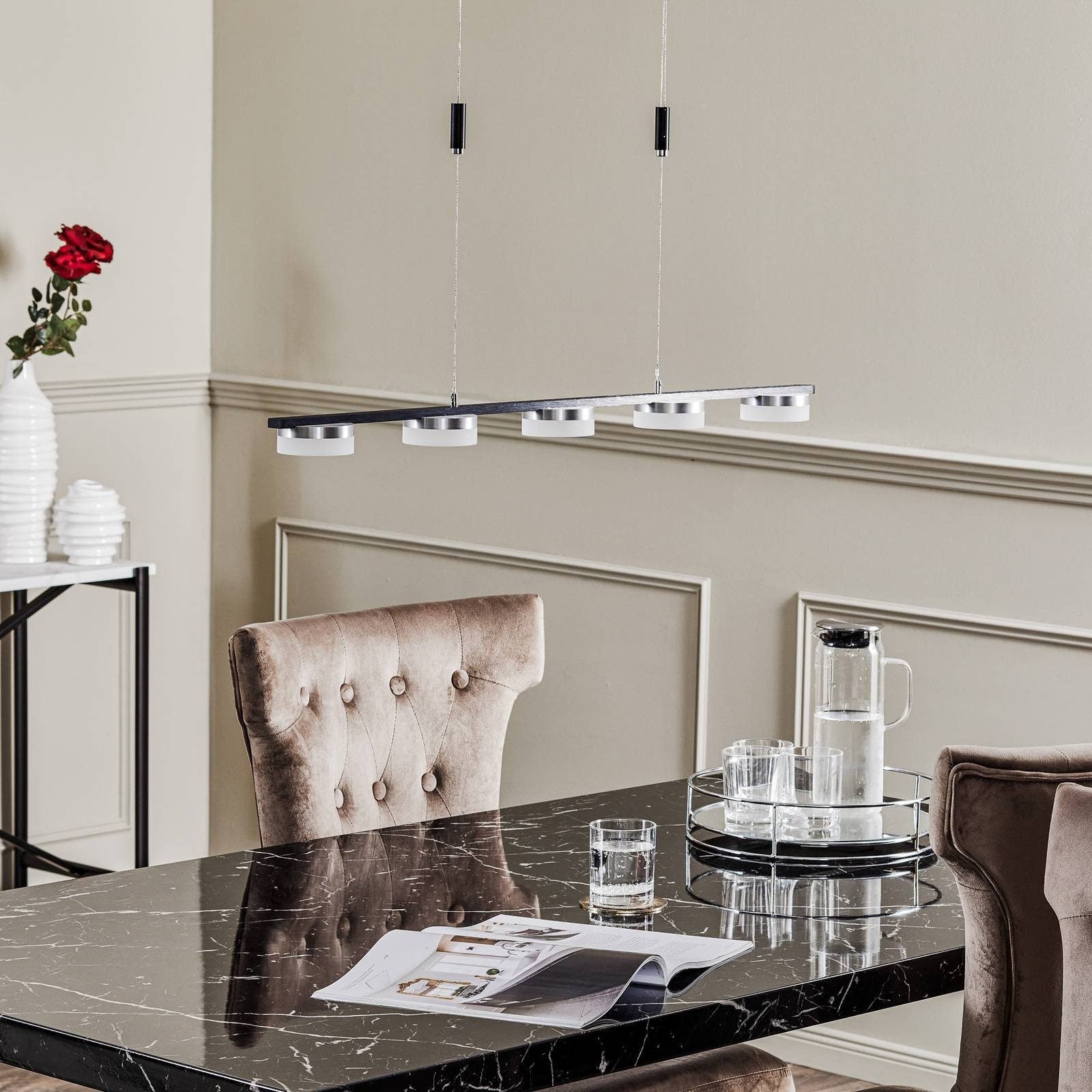 Kyree LED Pendelleuchte Light Anthrazit/Gold ist die offensichtliche Wahl für alle, die eine einfach gestaltete, aber dennoch stilvolle und praktische Pendelleuchte suchen, sei es für den Esstisch oder über anderen Flächen, die gut beleuchtet werden sollen. Die fünf Leuchtenköpfe haben jeweils eine eingebaute LED-Lichtquelle. Das Licht strahlt durch einen mattweißen Kunststoffschirm und sorgt so für eine blendfreie und gleichmäßige Ausleuchtung einer großen Fläche. Die Höhe der Leuchte lässt sich über die beiden Gewichte, die an den Schnüren der Pendelleuchten hängen, nach Belieben einstellen.